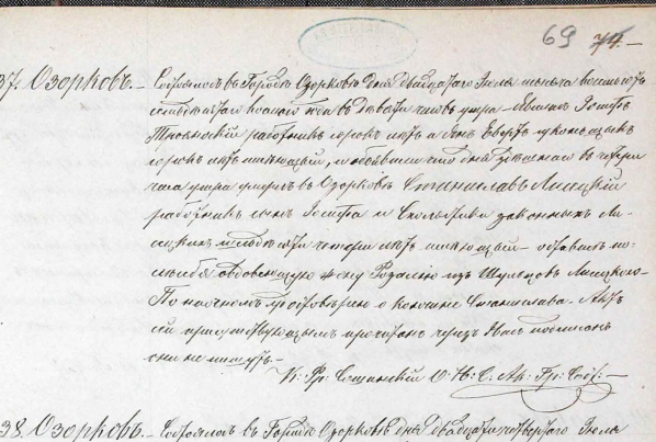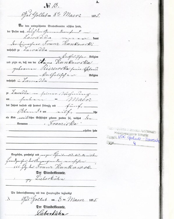 Działo się w mieście Ozorkowie dnia dwudziestego lipca tysiąc osiemset siedemdziesiątego ósmego roku o godzinie dziewiątej rano. Stawili się Józef Trojanoski, robotnik, lat czterdzieści i Jan Ewert, sukiennik, czterdzieści lat mający i oświadczyli, że dnia dzisiejszego o godzinie czwartej rano umarł w Ozorkowie Stanisław Lisiecki, robotnik, syn Józefa i Scholastyki prawowitych małżonków Lisieckich, lat sześćdziesiąt cztery mający. Zostawił po sobie owdowiałą żonę Rozalię z Szulców Lisiecką. Po naocznym stwierdzeniu zgonu Stanisława, akt ten obecnym przeczytany, przez nas podpisany, oni niepiśmienni.